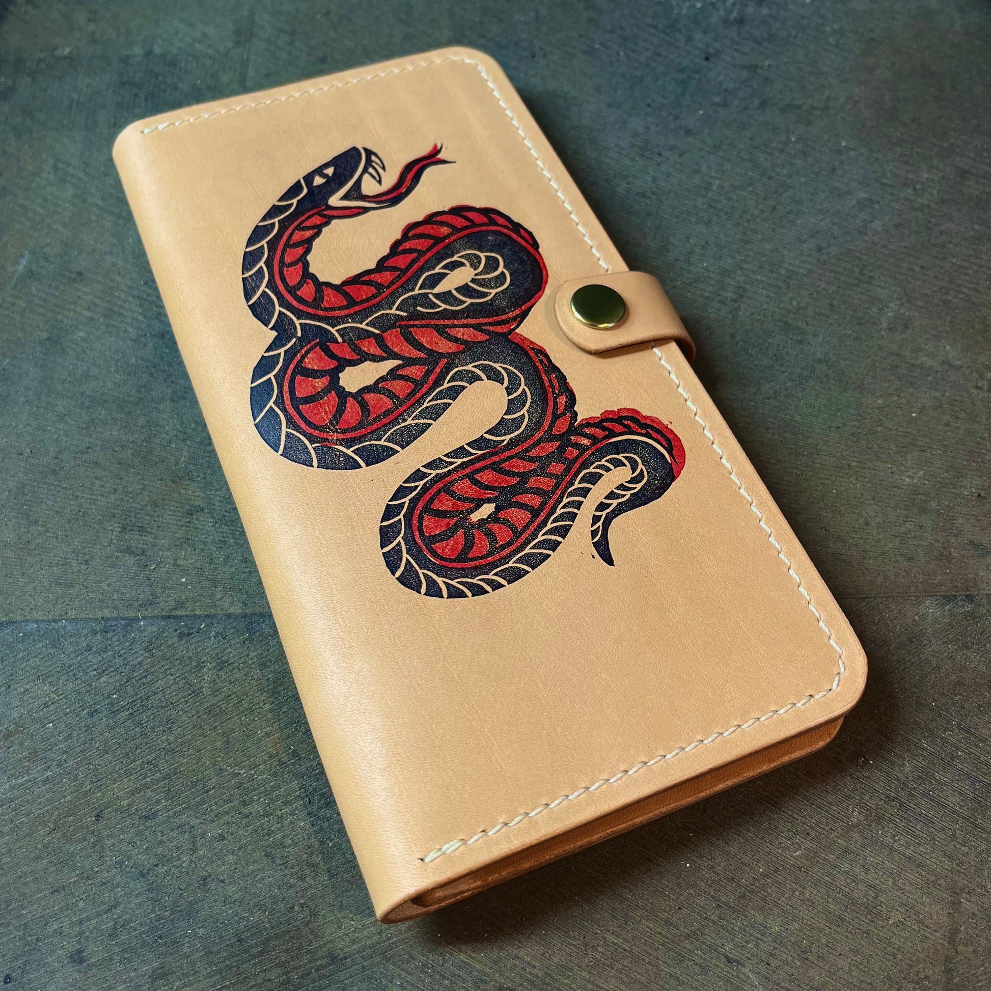 Natural leather, hand stitched with white thread. Solid brass zipper and snap.