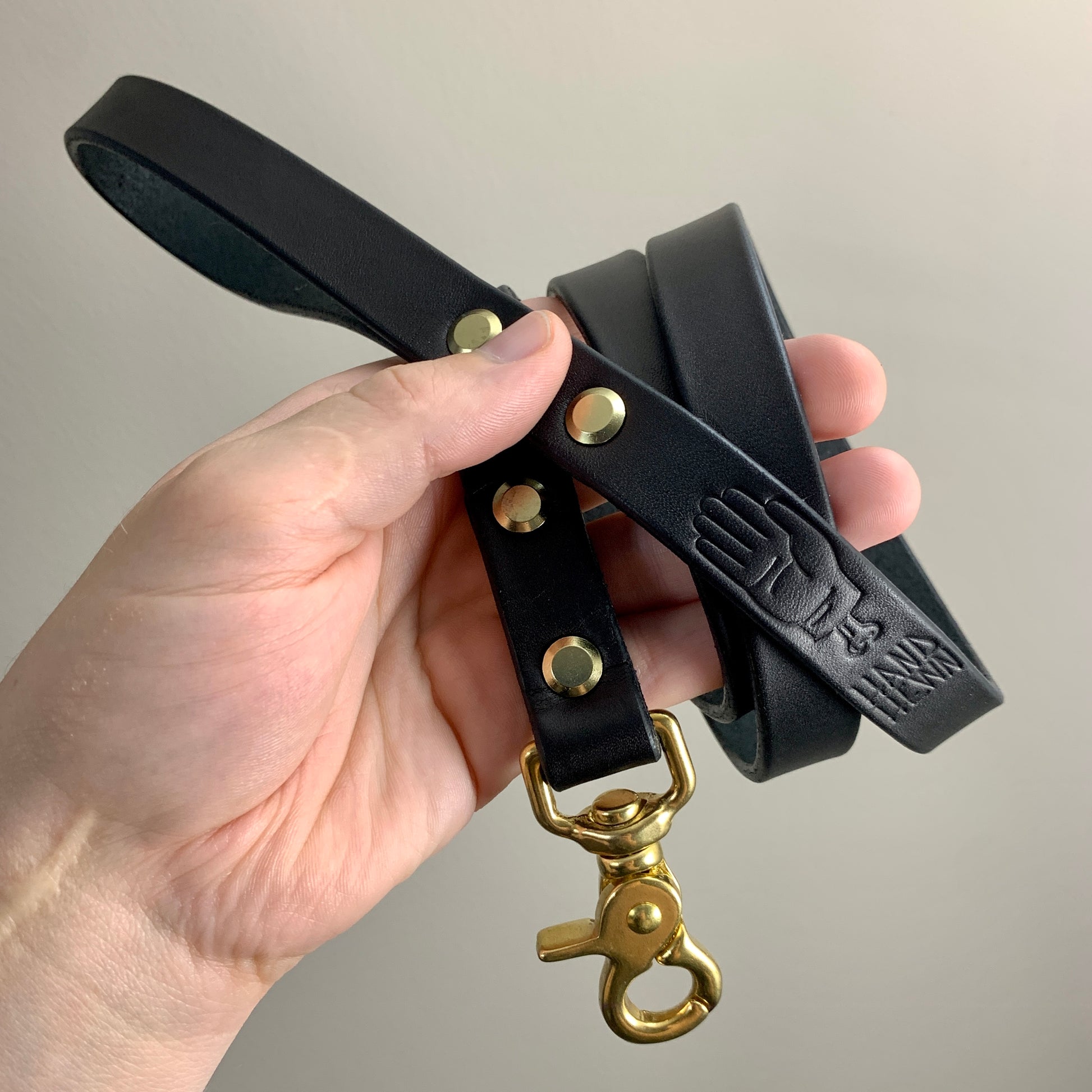 Crafted from beautiful black bridle leather and solid brass hardware, this leash measures in at 3/4” wide and 4 feet long. It will allow your dog the freedom to sniff and explore, while still giving you enough control to comfortably walk in busier urban settings.
