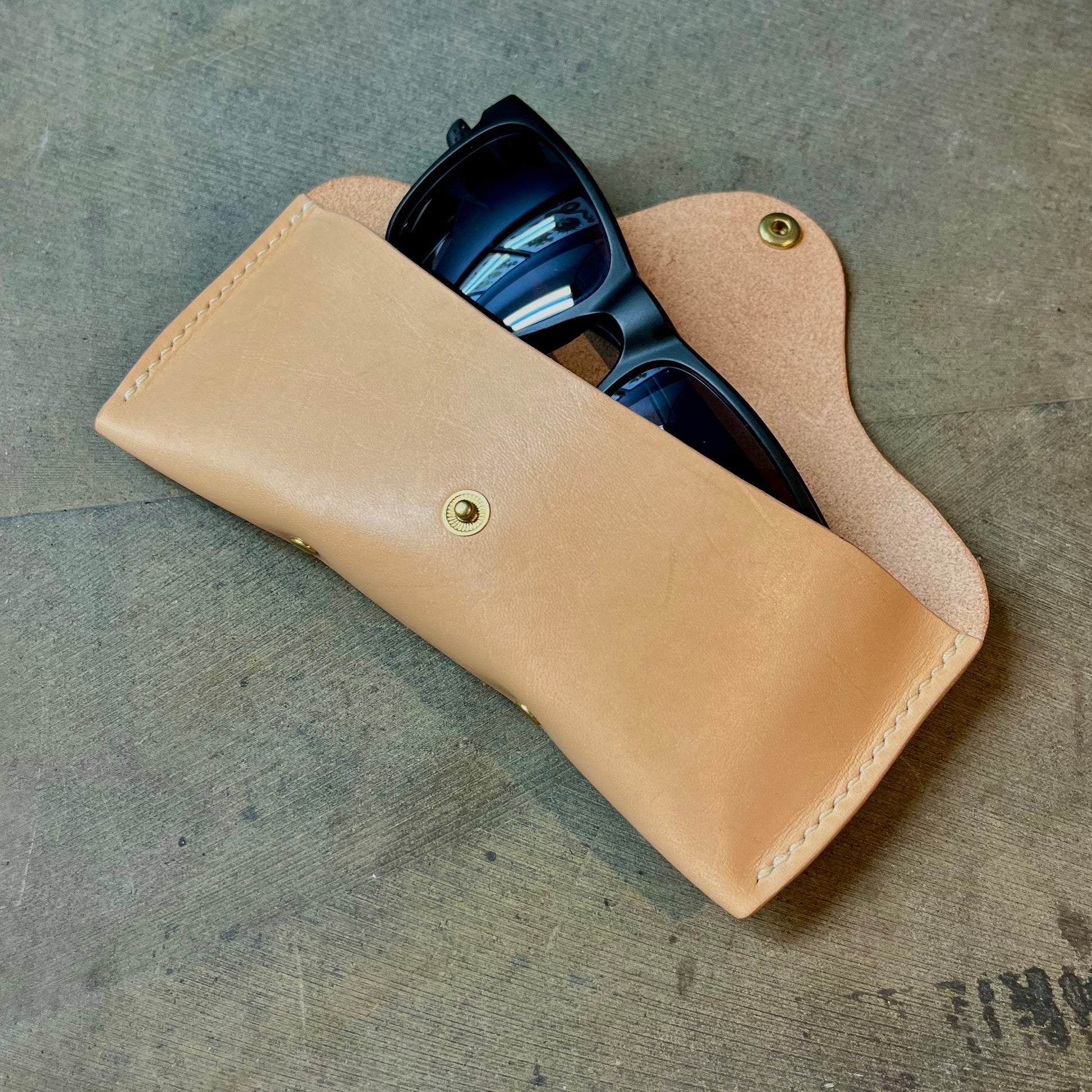 A leather glasses case to keep those specs or sunnies scratch-free. Natural leather with brass hardware, hand-stitched with white thread.