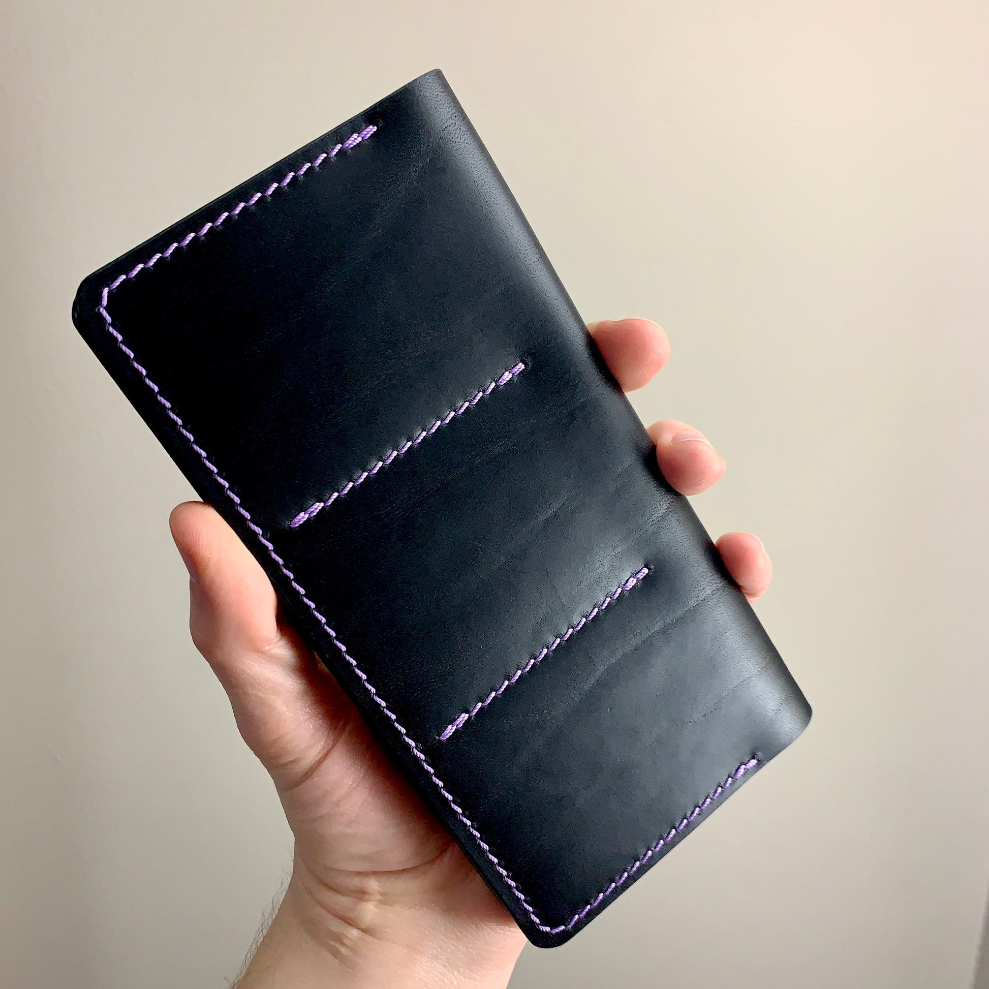 A wallet for those who prefer something bigger, but not too bulky, this one has 6 card pockets that can each fit 2+ cards, as well as a full-length cash slip.