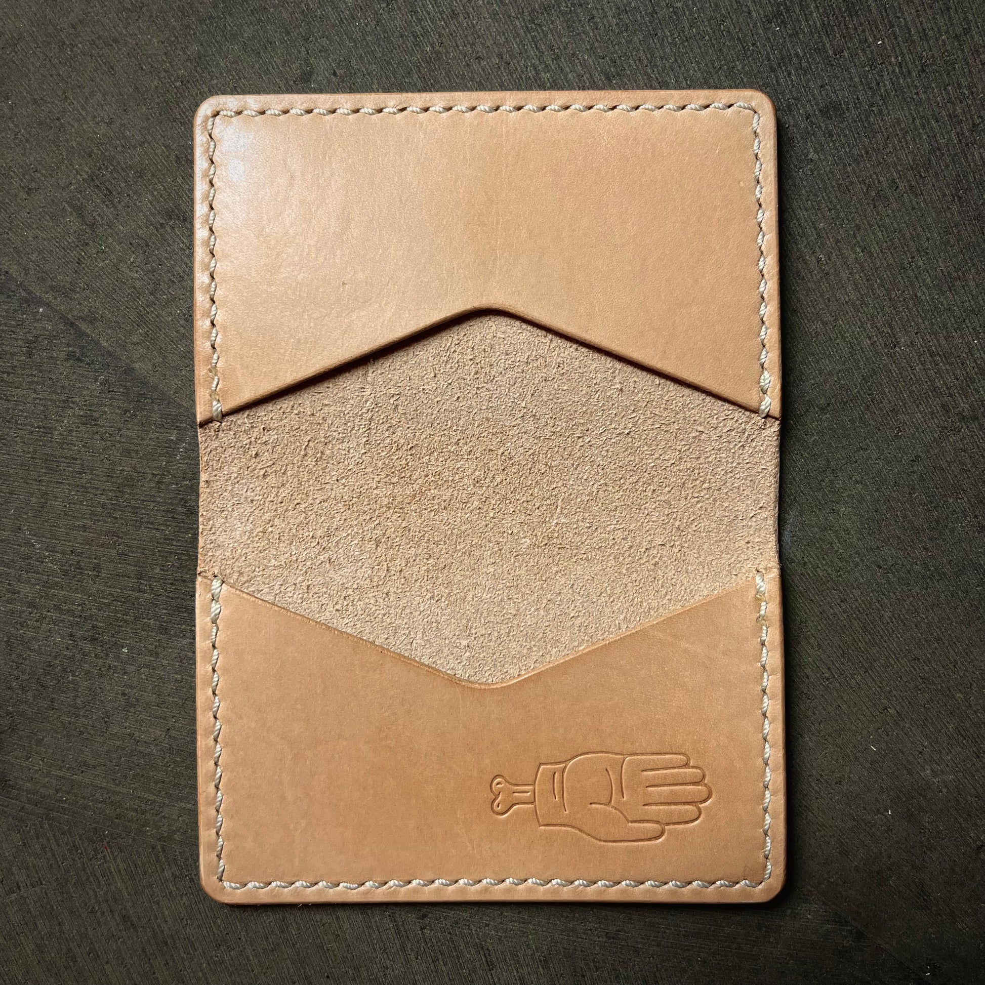 Natural leather, hand-stitched with white thread.