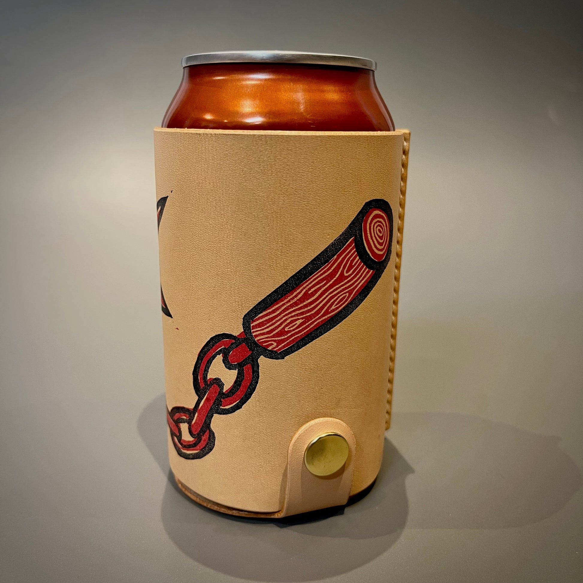 Our take on the classic beverage accessory, this coozie is made from natural veg tan leather, so it will patina drastically with use. The bottom is attached with solid brass snaps, so you can clip it to your bag when you're on the go. Sized to fit a 355mL can.