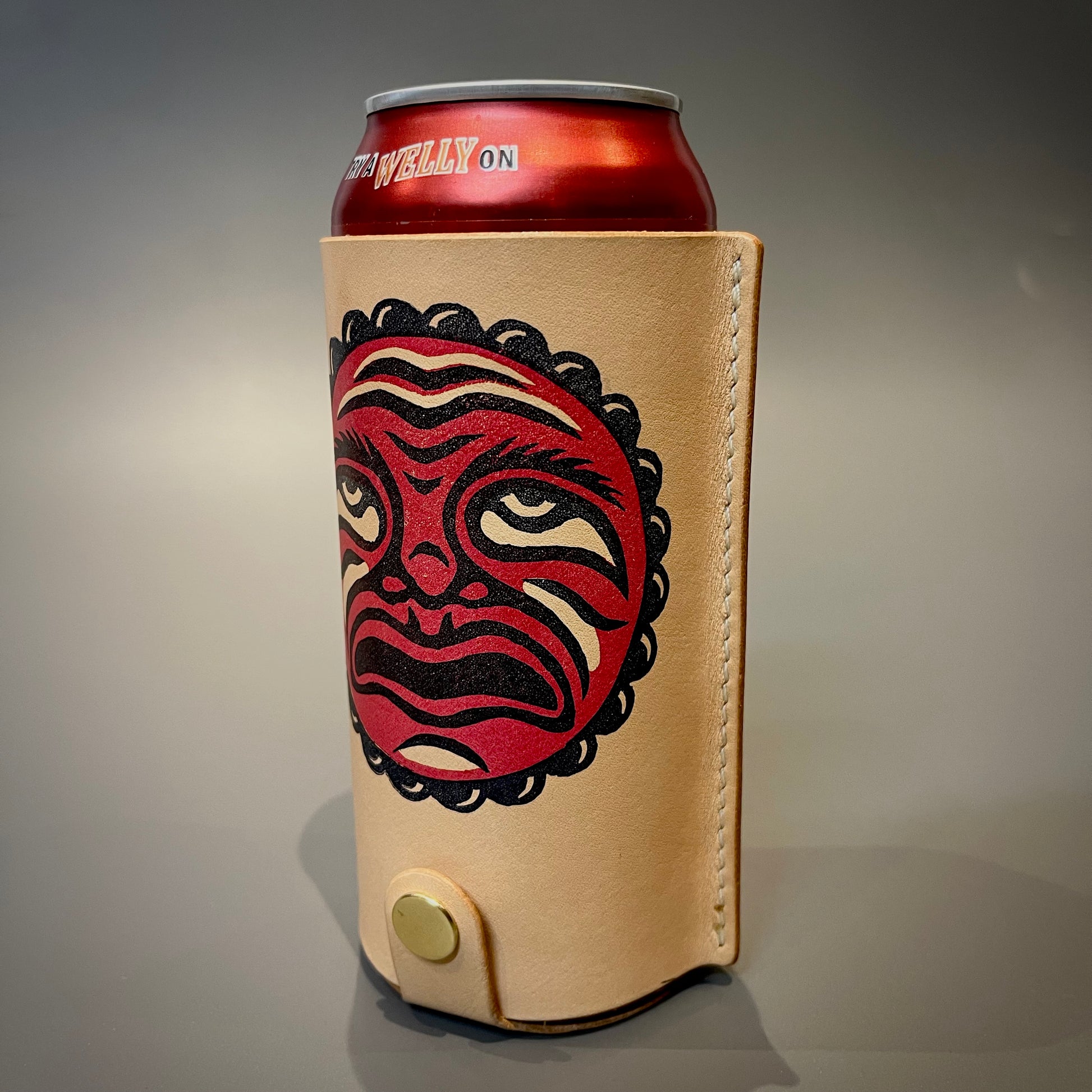 Our take on the classic beverage accessory, this coozie is made from natural veg tan leather, so it will patina drastically with use. The bottom is attached with solid brass snaps, so you can clip it to your bag when you're on the go. Sized to fit a 473mL can.